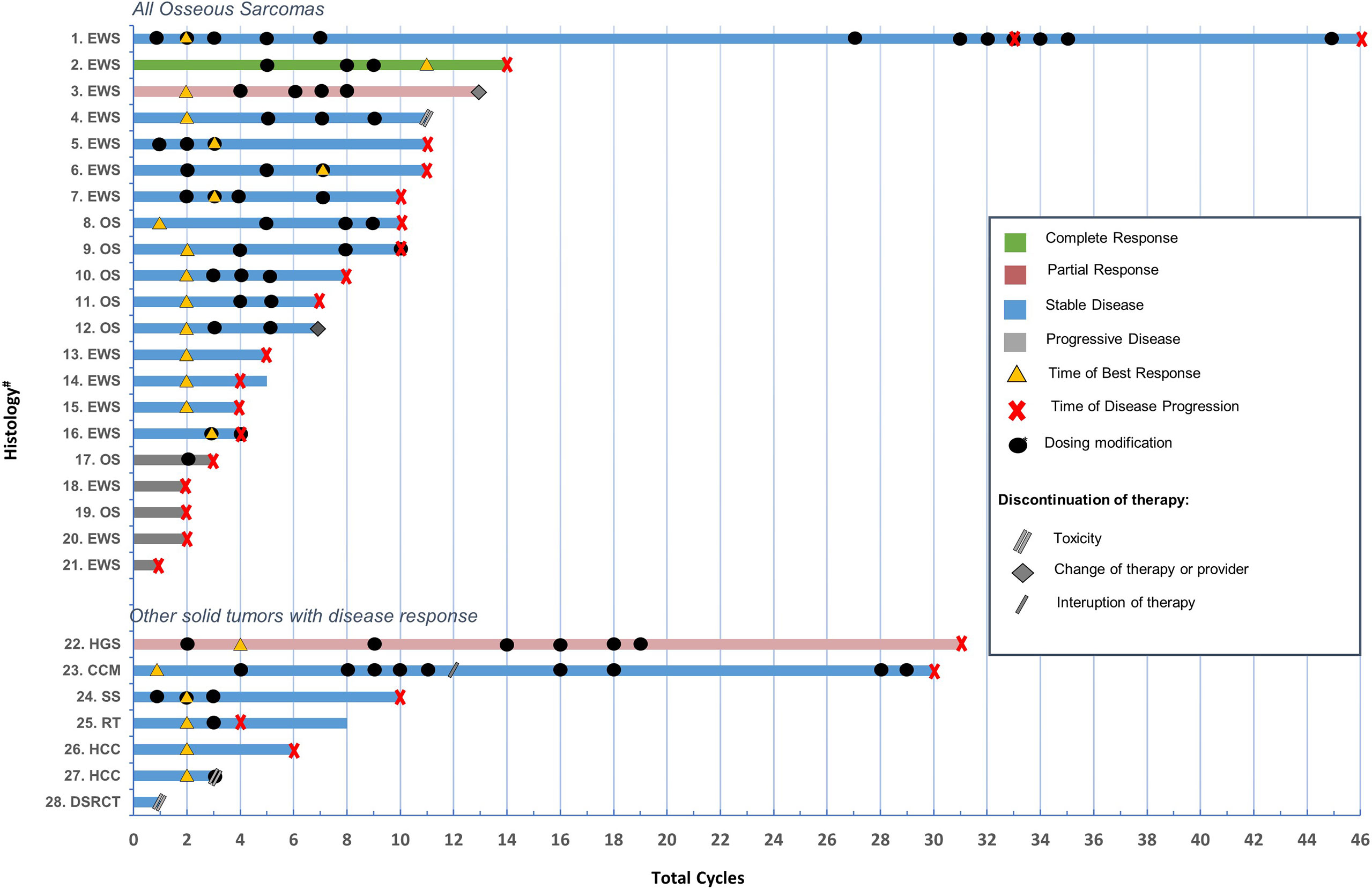 Conclusions: Intravenous bevacizumab combined with oral sorafenib and metronomic cyclophosphamide was tolerated and required minimal supportive care or additional clinic visits. Disease stabilization for prolonged time periods was observed in greater than half of the treated patients. Patients with bone sarcoma demonstrated a signal of activity suggesting possible benefit from incorporation of the therapy as a maintenance regimen in upfront setting, or as a palliative regimen.