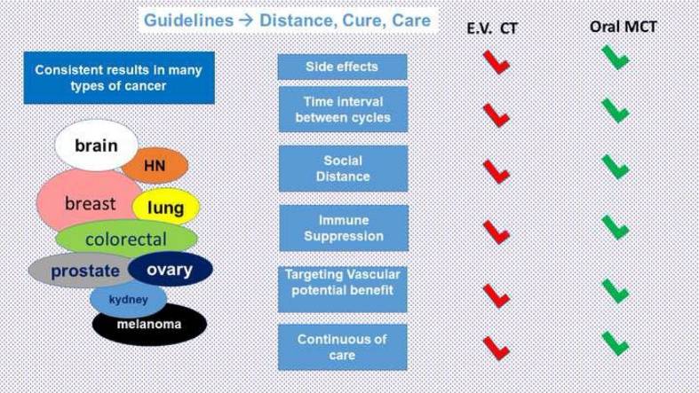 Recommendations and guidelines on how to manage cancer patients during COVID 19 pandemic have been published. Oral administration of chemotherapy is recommended to limit the access of cancer patients to hospital facilities and in some cases to guarantee the continuum of care.