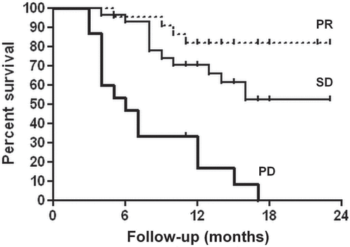 Results indicate that a favourable disease response (partial response or stable disease) was seen in 49 of 64 patients (76.6%), with mild acute toxicity occurring in 41 (64%). After a median follow-up of 14 months, 1-year overall survival was 62%. Pattern of disease relapse (p < 0.0001), time from initial treatment to relapse (p = 0.0002), and response to treatment (p < 0.0001) significantly affected survival. Age was the only factor that significantly correlated with treatment toxicity (p = 0.002; hazard ratio: 3.37; 95% confidence interval: 1.53 to 7.35)