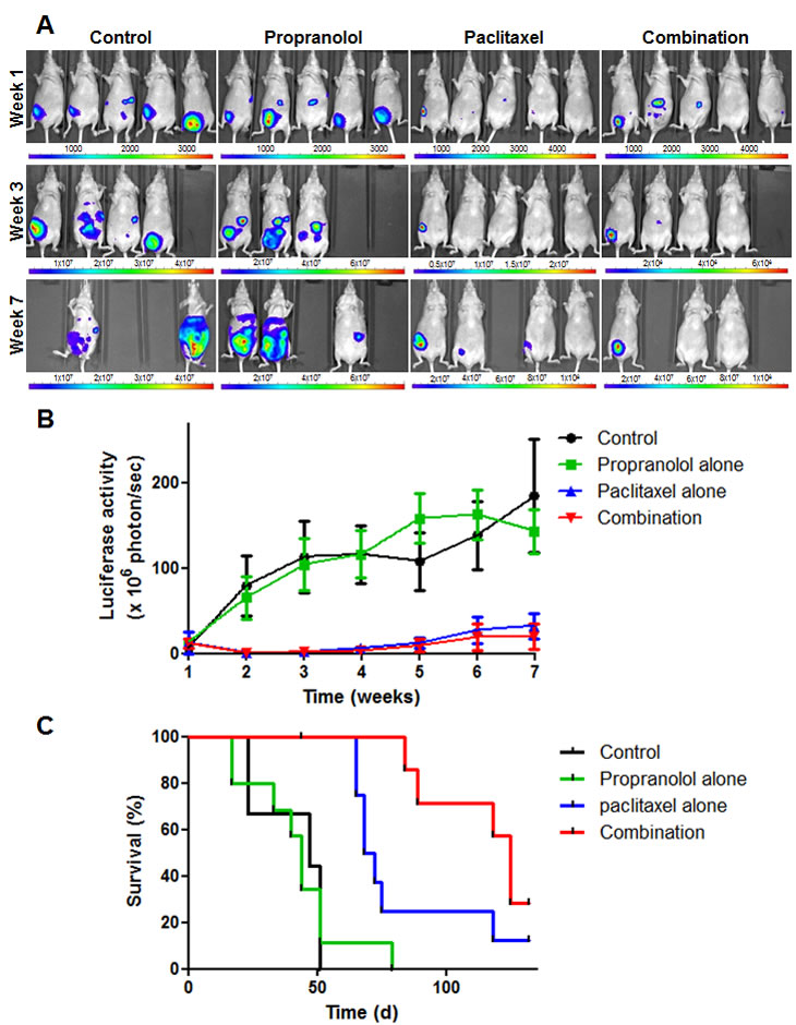 Recent clinical evidence revealed that the use of beta-blockers such as propranolol, prior to diagnosis or concurrently with chemotherapy, could increase relapse-free and overall survival in breast cancer patients. We therefore hypothesized that propranolol may be able to increase the efficacy of chemotherapy either through direct effects on cancer cells or via anti-angiogenic mechanisms. In vitro proliferation assay showed that propranolol (from 50-100 μM) induces dose-dependent anti-proliferative effects in a panel of 9 human cancer and “normal” cell lines. Matrigel assays revealed that propranolol displays potent anti-angiogenic properties at non-toxic concentrations (<50 μM) but exert no vascular-disrupting activity. Combining chemotherapeutic drugs, such as 5-fluorouracil (5-FU) or paclitaxel, with propranolol at the lowest effective concentration resulted in synergistic, additive or antagonistic effects on cell proliferation in vitro depending on the cell type and the dose of chemotherapy used. Interestingly, breast cancer and vascular endothelial cells were among the most responsive to these combinations. Furthermore, Matrigel assays indicated that low concentrations of propranolol (10 – 50 μM) potentiated the anti-angiogenic effects of 5-FU and paclitaxel. Using an orthotopic xenograft model of triple-negative breast cancer, based on s.c injection of luciferase-expressing MDA-MB-231 cells in the mammary fat pad of nude mice, we showed that propranolol, when used alone, induced only transient anti-tumor effects, if at all, and did not increase median survival. However, the combination of propranolol with chemotherapy resulted in more profound and sustained anti-tumor effects and significantly increased the survival benefits induced by chemotherapy alone (+19% and +79% in median survival for the combination as compared with 5-FU alone and paclitaxel alone, respectively; p<0.05). Collectively our results show that propranolol can potentiate the anti-angiogenic effects and anti-tumor efficacy of chemotherapy. The current study, together with retrospective clinical data, strongly suggests that the use of propranolol concurrently with chemotherapy may improve the outcome of breast cancer patients, thus providing a strong rationale for the evaluation of this drug combination in prospective clinical studies.